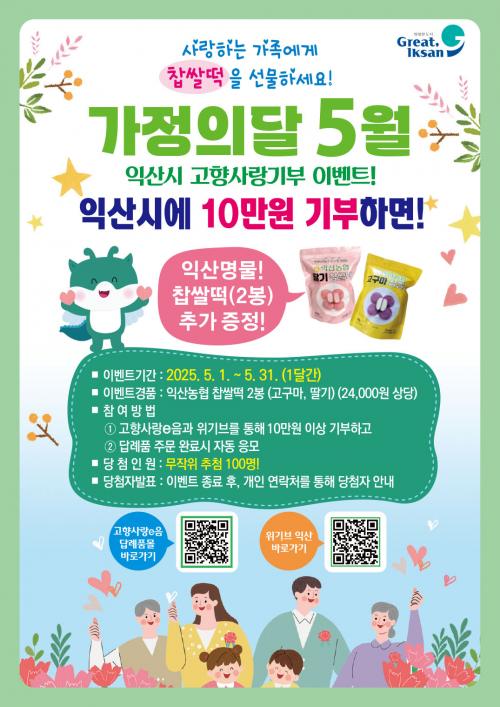 ÀÍ»ê½Ã´Â °¡Á¤ÀÇ ´ÞÀ» ¸Â¾Æ 5¿ù 1ÀϺÎÅÍ 31ÀϱîÁö '°íÇâ»ç¶û±âºÎÁ¦ ´ä·Êǰ Ãß°¡ ÁõÁ¤ À̺¥Æ®'¸¦ ÁøÇàÇÑ´Ù.