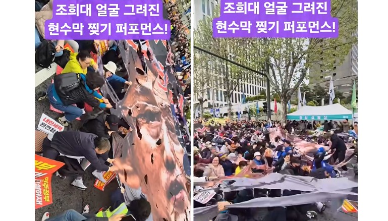 »çÁø=Áö³­ 3ÀÏ ´ë¹ý¿ø ¾Õ¿¡¼­ À±¼®¿­ źÇÙÀ» ÁÖµµÀûÀ¸·Î À̲ø¾ú´ø ½Ã¹Î´Üü ÃкÒÇൿÀÌ Á¶Èñ´ëÀÇ ¾ó±¼ÀÌ ±×·ÁÁø Çö¼ö¸·À» Âõ´Â ÆÛÆ÷¸Õ½º¸¦ Çϰí ÀÖ´Ù. ÃкÒÇൿtv À¯Æ©ºê ¿µ»ó