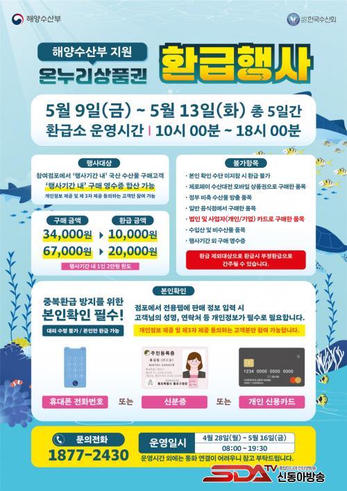 Çà»ç ±â°£ Áß ¿ÀÀ̵µÀüÅë¼ö»ê½ÃÀå ³» Âü¿© Á¡Æ÷¿¡¼­ ±¹³»»ê ¼ö»ê¹°À» ±¸¸ÅÇÑ ¼ÒºñÀÚ´Â ±¸¸Å¿µ¼öÁõ°ú ½ÅºÐÁõ ȤÀº º»ÀÎ ¸íÀÇ ÈÞ´ëÀüÈ­¸¦ ÁöÂüÇØ ¿ÀÀü 10½ÃºÎÅÍ ¿ÀÈÄ 6½Ã±îÁö ȯ±Þ ºÎ½º¸¦ ¹æ¹®ÇÏ¸é ±¸¸Å ±Ý¾×ÀÇ ÃÖ´ë 30%¸¦ ¿Â´©¸®»óǰ±ÇÀ¸·Î ȯ±Þ(Çà»ç ±â°£ ³», 1ÀÎ 2¸¸ ¿ø Çѵµ) ¹ÞÀ» ¼ö ÀÖ´Ù.