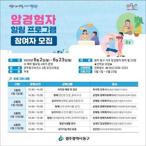 ÁÖ¿ä ³»¿ëÀº ¡ãÀÌÂ÷ ¾Ï ¿¹¹æ¡¤°ËÁø ¡ã¿ø¿¹ Ȱµ¿(²É ¹Ù±¸´Ï¡¤ÅäÇǾ ¸¸µé±â, ¹Ý·Á ½Ä¹° ½É±â) ¡ã½É¸®ÁöÁö(º¯ÈµÈ »î¿¡ ÀûÀÀÇϱ⡤³» ¾ÈÀÇ ºÒ¾È ´Ù½º¸®±â) ¡ã¿µ¾ç‧½Ä»ýȰ °ü¸® ¡ã»óÁö ±â´É °³¼± ¿îµ¿ µîÀ¸·Î ¾Ï °æÇèÀÚÀÇ ½É¸®Àû ¾ÈÁ¤°ú ü·Â ÁõÁø±îÁö ´Ù¾çÇÏ°Ô ±¸¼ºµÆ´Ù.