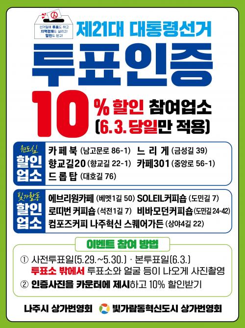 À̺¥Æ®´Â »çÀüÅõÇ¥ÀÏ(5¿ù29ÀÏ~30ÀÏ)°ú º»ÅõÇ¥ÀÏ(6¿ù 3ÀÏ)¿¡ ÅõÇ¥¼Ò ¹Û¿¡¼ ÅõÇ¥¼Ò¿Í ¾ó±¼ µîÀÌ ³ª¿À°Ô ÀÎÁõ»çÁøÀ» ÃÔ¿µÇØ ¸ÅÀå Ä«¿îÅÍ¿¡ Á¦½ÃÇϸé 10% ÇÒÀÎÇØÁÖ´Â ¹æ½ÄÀ¸·Î ÀÌ·ïÁö°í ÇÒÀÎÀº º»ÅõÇ¥ÀÏÀÎ 6¿ù 3ÀÏ ÇÏ·ç µ¿¾È¸¸ Àû¿ëµÈ´Ù.