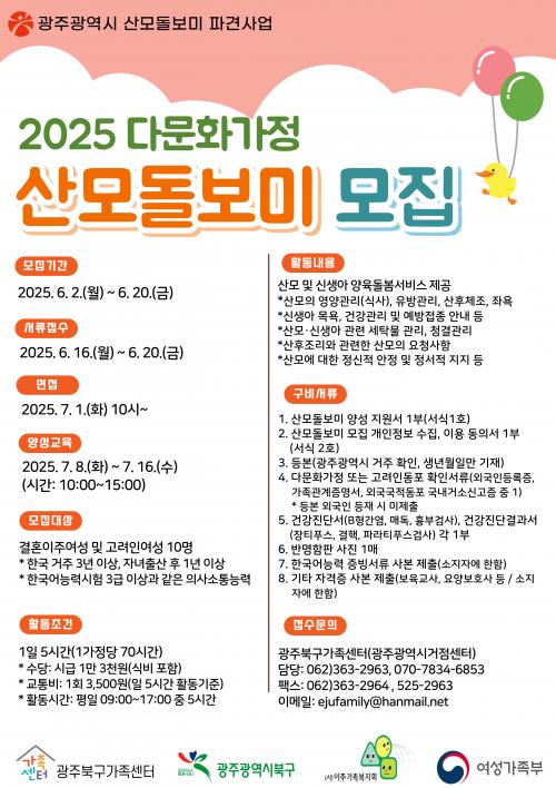 »ê¸ðµ¹º¸¹Ì ¼·ù Á¢¼ö´Â ¿À´Â 16ÀϺÎÅÍ 20ÀϱîÁö´Ù. ±¤Áֺϱ¸°¡Á·¼¾ÅÍ ´©¸®Áý(gjbukgu.familynet.or.kr)À» ÅëÇØ Áö¿ø¼¸¦ ³»·Á¹Þ¾Æ ÀÛ¼ºÇÑ µÚ ±¸ºñ¼·ù¿Í ÇÔ²² À̸ÞÀÏ(ejufamily@hanmail.net) ¶Ç´Â ÆÑ½º(062-363-2964, 062-525-2963)·Î ½ÅûÇÏ¸é µÈ´Ù. ÀÚ¼¼ÇÑ »çÇ×Àº ±¤Áֺϱ¸°¡Á·¼¾ÅÍ(062-363-2963, 070-7834-6853)·Î ¹®ÀÇÇÏ¸é µÈ´Ù.