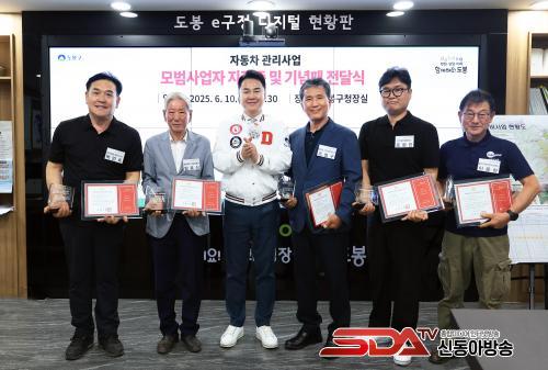 ¿À¾ð¼® µµºÀ±¸Ã»Àå°ú ½Å±Ô‧ÀçÁöÁ¤µÈ ÀÚµ¿Â÷°ü¸®»ç¾÷ ¸ð¹ü»ç¾÷ÀÚ 5°³¼Ò °ü°èÀÚ°¡ ±â³ä»çÁøÀ» Âï°í ÀÖ´Ù(2025. 6. 10. µµºÀ±¸Ã» ±¸Ã»Àå½Ç)(»çÁø ¿ÞÂÊ¿¡¼­ ¼¼ ¹øÂ° ¿À¾ð¼® µµºÀ±¸Ã»Àå)