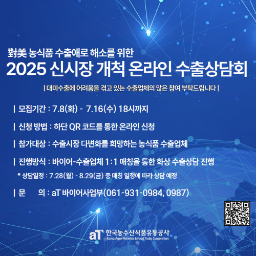 aT, ´ë(Óß)¹Ì ¼öÃâ ¾Ö·Î ´ëÀÀ ¡®³ó½Äǰ ½Å½ÃÀå °³Ã´ ¿Â¶óÀÎ »ó´ãȸ¡¯ Âü°¡±â¾÷ ¸ðÁý