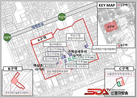°­³²±¸ º¥Ã³±â¾÷À°¼ºÃËÁøÁö±¸´Â â¾÷Áö¿ø½Ã¼³, ½ºÅ¸Æ®¾÷, ÅõÀÚ±â°üÀÌ ¹ÐÁýÇÑ º¥Ã³ Áß½ÉÁö´Ù. ¿ª»ïµ¿ 747-2¹øÁö ÀÏ¿ø(A±¸¿ª), µµ°îµ¿ 517-10 ÀÏ¿ø(B±¸¿ª), »ï¼ºµ¿ 37-18 ÀÏ¿ø(C±¸¿ª)À» Æ÷ÇÔÇØ 46¸¸¿©§³ ±Ô¸ð¿¡ À̸¥´Ù. °­³²±¸°¡ ¼¼Á¦ ÇýÅà µî º¥Ã³±â¾÷ »ýŰè Ȱ¼ºÀ» ¸ñÀûÀ¸·Î Áß¼Òº¥Ã³±â¾÷ºÎ¿¡ ÁöÁ¤ ½ÅÃ»ÇØ ÇØ´ç Áö±¸°¡ Á¶¼ºµÆÀ¸¸ç, ±¸´Â â¾÷±â¾÷ÀÇ ¿ª·®À» °­È­Çϱâ À§ÇØ ÀÌ °°Àº ÀÚü Áö¿ø »ç¾÷À» ²ÙÁØÈ÷ ÃßÁøÇϰí ÀÖ´Ù.
