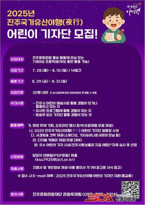 ¸ðÁý ´ë»óÀº ÁøÁÖ¹®È°ü±¤ È«º¸¿¡ °ü½É ÀÖ´Â 7¼¼ ÀÌ»ó ÃʵîÇлýÀ¸·Î ºÎ¸ð´Ô µ¿¹Ý Ȱµ¿µµ °¡´ÉÇϸç, ¹æ¼ÛºÎ¡¤±âÀÚ´Ü È°µ¿ °æÇèÀÚ¿Í ÁøÁֽà ¾î¸°ÀÌ ÇØ¼³»ç Ȱµ¿ °æÇèÀÚ¿¡°Ô´Â ¿ì´ë±âȸ°¡ ÁÖ¾îÁø´Ù. ÃÑ 20¸íÀ» ¼±¹ßÇϸç, ±âÀÚ´ÜÀº 8¿ù 14ÀÏ ¹ß´ë½ÄÀ» ½ÃÀÛÀ¸·Î 8¿ù 29ÀÏ~31ÀϱîÁö ¾ßÇà °ü·Ã ÃëÀç Ȱµ¿À» ÁøÇàÇÑ´Ù.