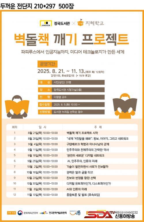 À̹ø Àå°îµµ¼°ü ÇÁ·Î±×·¥Àº ¡®ÆÄÇǷ罺¿¡¼ ÀΰøÁö´É±îÁö, ¹Ìµð¾îÅ×Å©³î·ÎÁö°¡ ¸¸µç ¼¼°è(º®µ¹Ã¥ ±ú±â ÇÁ·ÎÁ§Æ®)¡¯¸¦ ÁÖÁ¦·Î À¯¹ß Ç϶ó¸®ÀÇ ¡¸³Ø¼½º¡¹, ´Ù·Ð ¾ÆÁ¦¸ðÀ»·çÀÇ ¡¸±Ç·Â°ú Áøº¸¡¹ µîÀ» ÇÔ²² ÀÐÀ¸¸ç ¿À´Ã³¯ ÀΰøÁö´É ½Ã´ë¿¡ ÇÊ¿äÇÑ ½Ã°¢°ú »ç°í¹æ½ÄÀ» ±â¸£´Â ¡®¹Ìµð¾î ¸®ÅÍ·¯½Ã(¸Åü ÀÌÇØ·Â)¡¯¿¡ ÁßÁ¡À» µÎ°í ±âȹµÆ´Ù. ÀΰøÁö´É°ú ¹Ìµð¾î¸¦ ÀÌÇØÇϰí Àϻ󿡼 ½Çõ ¹æ¾ÈÀ» ã¾Æº¸´Â Â÷º°ÈµÈ ³»¿ëÀ¸·Î ÁøÇàÇÒ ¿¹Á¤ÀÌ´Ù.