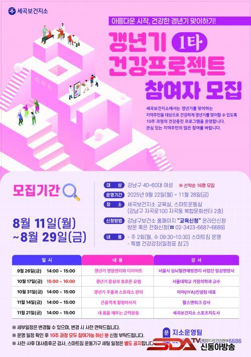 ¿îµ¿ ÇÁ·Î±×·¥°ú ´õºÒ¾î °»³â±â Áõ»ó ¿ÏÈ¿Í »ýȰ½À°ü °³¼±À» À§ÇÑ °Ç°°Áµµ 5ȸ ¿¸°´Ù. °»³â±â ¿µ¾ç °ü¸®¿Í ´ÙÀÌ¾îÆ®(9¿ù 26ÀÏ), °»³â±â Áõ»ó°ú È£¸£¸ó ¿ä¹ý(10¿ù 17ÀÏ), °»³â±â ¿ì¿ï¡¤½ºÆ®·¹½º °ü¸®(10¿ù 31ÀÏ), ±Ù°ñ°Ý°è Èú¸µ ¸¶»çÁö(11¿ù 14ÀÏ), ³» ¸öÀ» ±ú¿ì´Â ±Ù·Â¿îµ¿(11¿ù 21ÀÏ) µî ½Ç»ýȰ¿¡ ¹Ù·Î Àû¿ë °¡´ÉÇÑ ³»¿ëÀ¸·Î ±¸¼ºµÆ´Ù. °Á´ç Á¤¿øÀº 25¸íÀ̸ç, º¸°Ç¼Ò ȨÆäÀÌÁö¿¡¼ ¼ö° ½ÅûÇÒ ¼ö ÀÖ´Ù.