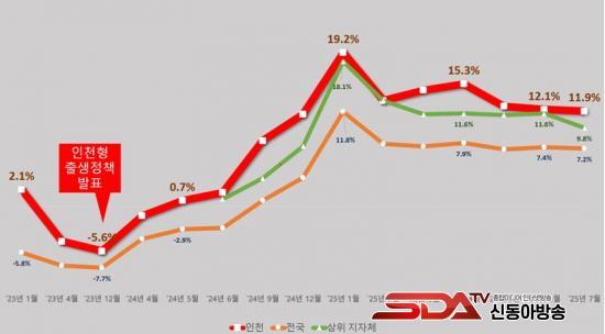 Åë°èûÀÌ ¹ßÇ¥ÇÑ 2025³â 7¿ù Àα¸µ¿Çâ¿¡ µû¸£¸é Àü±¹ Ãâ»ý¾Æ ¼ö Áõ°¡À²Àº 7.2%¿¡ ±×ÃÄ, ÀÎõÀÌ ¼öµµ±Ç ³» ´Ù¸¥ ´ëµµ½Ã¿Í ºñ±³Çصµ »ó´ëÀûÀ¸·Î ³ôÀº ¼öÁØÀÓÀÌ È®ÀεƴÙ.