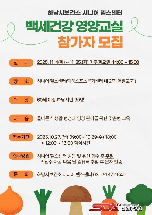 Âü°¡ ¸ðÁýÀº 10¿ù 27ÀÏ(¿ù) ¿ÀÀü 9½ÃºÎÅÍ 29ÀÏ(¼ö) ¿ÀÈÄ 6½Ã±îÁö ÁøÇàµÇ¸ç, Çϳ²½Ã¿¡ °ÅÁÖÇÏ´Â 60¼¼ ÀÌ»ó ½Ã¹ÎÀÌ¸é ´©±¸³ª ½Åû °¡´ÉÇÏ´Ù. ½ÅûÀº ½Ã´Ï¾î Çコ¼¾ÅÍ ¹æ¹® ¶Ç´Â À¯¼±(¢Ï031-5182-1640)À¸·Î Á¢¼öÇÒ ¼ö ÀÖÀ¸¸ç, Á¢¼ö ¸¶°¨ ´ÙÀ½ ³¯ Ãß÷À» ÅëÇØ ÃÖÁ¾ 30¸íÀ» ¼±Á¤ÇÑ´Ù.
