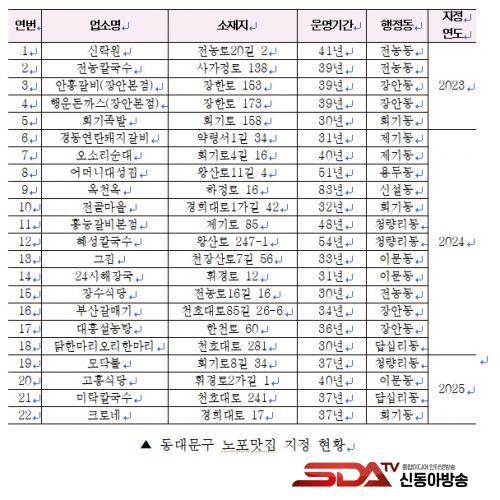 µ¿´ë¹®±¸´Â Áö¿ªÀÇ Á¤¼¿Í ¿ª»ç¼ºÀ» Áö´Ñ ¿ì¼ö À½½ÄÁ¡À» ü°èÀûÀ¸·Î ¹ß±¼Çϰí È«º¸ÇϰíÀÚ 2023³â ¼¿ï½Ã ÃÖÃʷΡ¸¼¿ïƯº°½Ã µ¿´ë¹®±¸ ³ëÆ÷¸ÀÁý ÀÎÁõ ¹× Áö¿ø¿¡ °üÇÑ Á¶·Ê¡¹¸¦ Á¦Á¤Çß´Ù. ÀÌ¿¡ µû¶ó 30³â ÀÌ»ó ¿î¿µÇÑ ¾÷¼Ò¸¦ ´ë»óÀ¸·Î ½É»ç¸¦ °ÅÃÄ ³ëÆ÷¸ÀÁýÀ» ¼±Á¤Çϰí ÀÖÀ¸¸ç, ¿ÃÇØ´Â ½Å±Ô 4°³¼Ò°¡ Ãß°¡µÇ¾î ÃÑ 22°³¼Ò°¡ ³ëÆ÷¸ÀÁýÀ¸·Î ¿î¿µµÇ°í ÀÖ´Ù.