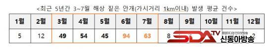 3¿ù~7¿ùÀº ÇØ¼ö¿Í ´ë±â ¿Âµµ Â÷·Î ÀÎÇØ ½ÃÁ¤ 1km À̳»ÀÇ Â£Àº ¾È°³(³ó¹«)°¡ ÀÚÁÖ ¹ß»ýÇÏ´Â ½Ã±â·Î, ƯÈ÷ 6¿ù°ú 7¿ù¿¡´Â ¿¬¾ÈÇØ¿ªÀ» Áß½ÉÀ¸·Î ¾È°³ ¹ß»ý ºóµµ°¡ ³ôÀº °ÍÀ¸·Î ºÐ¼®µÆ´Ù.