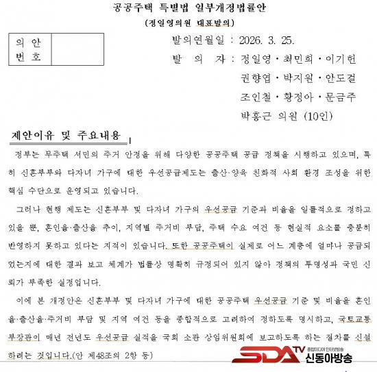 ¸ÕÀú, ¡¸°ø°øÁÖÅÃÆ¯º°¹ý¡¹°³Á¤¾ÈÀº ¡ã½ÅÈ¥ºÎºÎ ÁÖÅðø±Þ ±âÁØ¿¡ È¥ÀÎÀ², Ãâ»êÀ², Áö¿ªº° Áְźñ ¼öÁØ µîÀ» º¸´Ù ¼¼ºÐÈÇÏ¿© ¹Ý¿µÇϵµ·Ï Çϰí, ¡ãÁ¤ºÎ°¡ °ø±Þ ±âÁذú ½ÇÀûÀ» ±¹È¸¿¡ º¸°íÇϵµ·Ï Àǹ«ÈÇß´Ù. ½ÅÈ¥ºÎºÎ ÁÖ°Å Áö¿ø Á¦µµ°¡ Çö½ÇÀ» Á¦´ë·Î ¹Ý¿µÇϰí ÀÖ´ÂÁö ±¹È¸°¡ Áö¼ÓÀûÀ¸·Î Á¡°ËÇÒ ¼ö ÀÖµµ·Ï Çϰڴٴ ÃëÁö´Ù.
