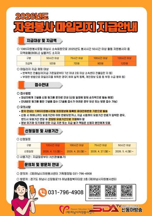 ¼¾ÅÍ´Â 1365ÀÚ¿øºÀ»çÆ÷Åп¡ Çϳ²½Ã ¼Ò¼Ó ȸ¿øÀ¸·Î µî·ÏµÈ ÀÚ¿øºÀ»çÀÚ °¡¿îµ¥ 2025³âµµ ºÀ»ç ½Ã°£ÀÌ 50½Ã°£ ÀÌ»óÀÎ ½ÇÀû º¸À¯ÀÚ¸¦ ´ë»óÀ¸·Î ÀÚ¿øºÀ»ç ¸¶Àϸ®Áö¸¦ Áö±ÞÇÑ´Ù°í ¹àÇû´Ù. Áö±Þ ¼ö´ÜÀº Çϳ²½Ã Áö¿ªÈÆóÀÎ ¡®ÇϸӴϡ¯ ½Ç¹° Ä«µå ÃæÀü ¹æ½ÄÀ̸ç, ºÀ»ç ½Ã°£ ±¸°£¿¡ µû¶ó Â÷µî Áö±ÞµÈ´Ù.