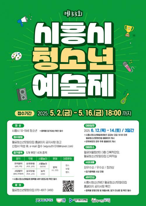 [½Åµ¿¾Æ¹æ¼Û ½ÃÈï½Ã=À̽ŵ¿±âÀÚ] (Àç)½ÃÈï½Ãû¼Ò³âÀç´Ü ¿ù°ùû¼Ò³â¹®È­ÀÇÁýÀº ¡®2025³â Á¦33ȸ ½ÃÈï½Ãû¼Ò³â¿¹¼úÁ¦(ÀÌÇÏ Ã»¼Ò³â¿¹¼úÁ¦)¡¯ Âü°¡ÀÚ¸¦ 5¿ù 2ÀϺÎÅÍ 5¿ù 16ÀÏ 18½Ã±îÁö ¸ðÁýÇÑ´Ù. ¸ðÁý ´ë»óÀº 2007³âºÎÅÍ 2016³â »çÀÌ Ãâ»ýÇÑ ÃÊ¡¤Áß¡¤°í û¼Ò³âÀ¸·Î, ½ÃÈ