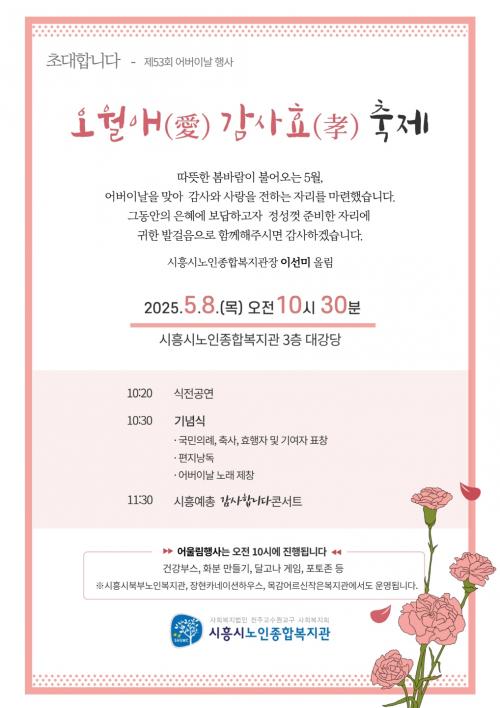 [½Åµ¿¾Æ¹æ¼Û ½ÃÈï½Ã=À̽ŵ¿±âÀÚ] ½ÃÈï½Ã³ëÀÎÁ¾ÇÕº¹Áö°üÀÌ ÁÖ°üÇÏ´Â Á¦53ȸ ¾î¹öÀ̳¯ ±â³ä ¡®¿À¿ù¾Ö(äñ), °¨»çÈ¿(üø) ÃàÁ¦¡¯°¡ 5¿ù 8ÀÏ, ½ÃÈï½Ã³ëÀÎÁ¾ÇÕº¹Áö°ü¿¡¼­ °³ÃÖÇÑ´Ù. À̳¯ Çà»ç´Â ¾î¹öÀ̳¯À» ¸Â¾Æ Áö¿ª ¾î¸£½ÅÀ» ÃÊ´ëÇØ ¾î¸£½Å¿¡°Ô °¨»çÀÇ ¸¶À½À» ÀüÇϰí, °æ·Î¡¦