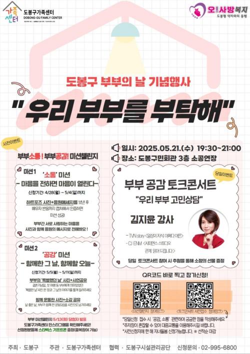 [½Åµ¿¾Æ¹æ¼Û µµºÀ±¸=À̽ŵ¿±âÀÚ] ¼­¿ï µµºÀ±¸°¡ 5¿ù 21ÀÏ µµºÀ±¸¹Îȸ°ü 3Ãþ ¼Ò°ø¿¬Àå¿¡¼­ ºÎºÎÀÇ ³¯(5¿ù 21ÀÏ)À» ±â³äÇØ '¿ì¸® ºÎºÎ¸¦ ºÎÅ¹ÇØ' Çà»ç¸¦ °³ÃÖÇÑ´Ù. µµºÀ±¸°¡Á·¼¾ÅÍÀÇ ÁÖ°üÀ¸·Î ¿­¸®´Â À̹ø Çà»ç¿¡¼­´Â ±èÁöÀ± °­»çÀÇ ÅäÅ© Äܼ­Æ®°¡ ÁøÇàµÈ´Ù. ±èÁöÀ±¡¦