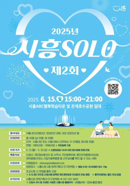 [½Åµ¿¾Æ¹æ¼Û ½ÃÈï½Ã=À̽ŵ¿±âÀÚ] ½ÃÈï½Ã´Â ûÃá³²³àµé¿¡°Ô ¼ÒÁßÇÑ Àο¬À» ¸¸³¯ ±âȸ¸¦ Á¦°øÇÏ°í °áÈ¥ ģȭ ºÐÀ§±â¸¦ Á¶¼ºÇϱâ À§ÇØ ¡®2025³â Á¦2ȸ ½ÃÈï ¼Ö·Î(SOLO)¡¯ Çà»ç¸¦ °³ÃÖÇÏ°í ¹ÌÈ¥³²³à Âü°¡ÀÚ¸¦ 5¿ù ¸»±îÁö ¸ðÁýÇÑ´Ù. Çà»ç´Â ¿À´Â 6¿ù 15ÀÏ ¿ÀÈÄ 3½ÃºÎÅÍ 9½Ã¡¦