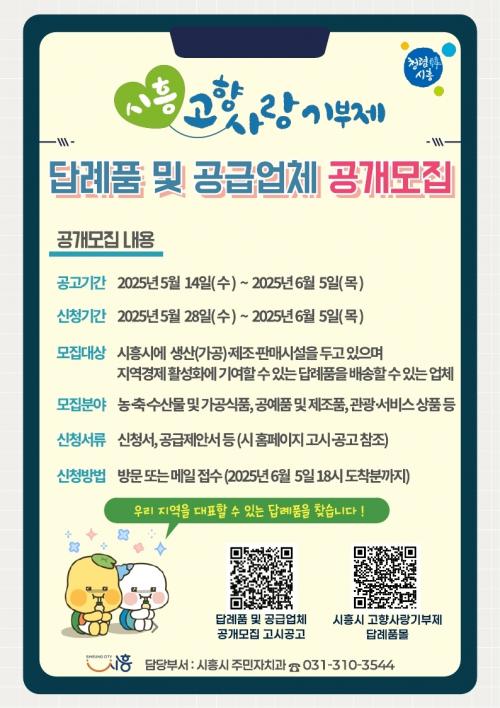 [½Åµ¿¾Æ¹æ¼Û ½ÃÈï½Ã=À̽ŵ¿±âÀÚ] ½ÃÈï½Ã´Â ¡¯2025³âµµ ½ÃÈï½Ã °íÇâ»ç¶û±âºÎÁ¦ ´ä·Êǰ ¹× °ø±Þ¾÷ü¡®¸¦ ¿À´Â 6¿ù 5ÀϱîÁö °ø°³ ¸ðÁýÇÑ´Ù. À̹ø ¸ðÁýÀº ½ÃÈï½Ã °íÇâ»ç¶û±âºÎÁ¦ ±âºÎÀÚ¿¡°Ô ½ÃÈï½ÃÀÇ Áö¿ªÀÚ¿øÀ» Ȱ¿ëÇÑ ´Ù¾çÇÑ ´ä·ÊǰÀ» Á¦°øÇϰí, Áö¿ª°æÁ¦¸¦ Ȱ¼ºÈ­Çϱâ À§¡¦