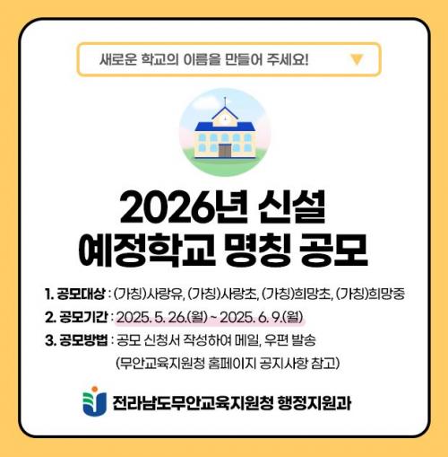 [½Åµ¿¾Æ¹æ¼Û Àü³²¹«¾È=À̽ŵ¿±âÀÚ] Àü¶ó³²µµ¹«¾È±³À°Áö¿øÃ»Àº 2026³â °³±³ ¿¹Á¤ÀÎ ¹«¾È±º ¿À·æ2Áö±¸ ½Å¼³ À¯¡¤ÃÊ¡¤ÁßÇб³ 4°³±³ÀÇ ±³¸íÀ» °ø¸ðÇÑ´Ù. ±³¸í °ø¸ð ´ë»ó Çб³´Â (°¡Äª)»ç¶ûÀ¯Ä¡¿ø, (°¡Äª)»ç¶ûÃʵîÇб³, (°¡Äª)Èñ¸ÁÃʵîÇб³, (°¡Äª)Èñ¸ÁÁßÇб³ 4°³±³·Î, Àü¶ó¡¦