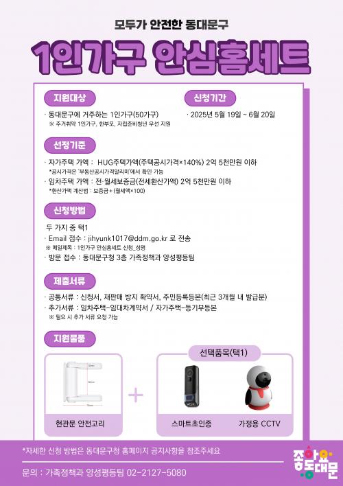 [½Åµ¿¾Æ¹æ¼Û µ¿´ë¹®±¸=À̽ŵ¿±âÀÚ] ¼­¿ï µ¿´ë¹®±¸´Â 1ÀÎ °¡±¸ÀÇ ÁÖ°Å ¾ÈÀü °­È­¸¦ À§ÇØ ¡®¾È½ÉȨ¼¼Æ®¡¯ Áö¿ø »ç¾÷À» ½ÃÇàÇÑ´Ù. ¡®¾È½ÉȨ¼¼Æ®¡¯´Â Çö°ü¹® ¾ÈÀü°í¸®¿Í ÇÔ²² ½º¸¶Æ® ÃÊÀÎÁ¾ ¶Ç´Â °¡Á¤¿ë CCTV Áß Çϳª¸¦ ¼±ÅÃÇØ ¼³Ä¡ÇÒ ¼ö ÀÖµµ·Ï ±¸¼ºµÇ¾î ÀÖ´Ù. ÃÖ±Ù¡¦
