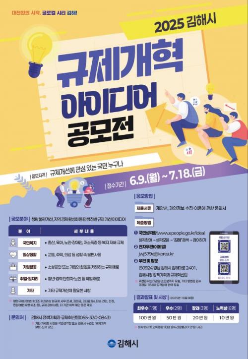 [½Åµ¿¾Æ¹æ¼Û °æ³²±èÇØ=³²±Ã¿µ±â±âÀÚ] ±èÇØ½Ã´Â Àϻ󿡼­ °Þ°í ÀÖ´Â ºÒÇÕ¸®ÇÑ ±ÔÁ¦¸¦ ¹ß±¼¡¤°³¼±Çϱâ À§ÇØ ¡°2025³â ±èÇØ½Ã ±ÔÁ¦°³Çõ ¾ÆÀ̵ð¾î °ø¸ðÀü¡±À» °³ÃÖÇÑ´Ù°í ¹àÇû´Ù. Á¢¼ö±â°£Àº ¿À´Â 9ÀϺÎÅÍ 7¿ù 18ÀϱîÁöÀ̸ç, ±ÔÁ¦°³¼±¿¡ °ü½É ÀÖ´Â ½Ã¹Î, ´Üü, ±â¾÷ µî¡¦