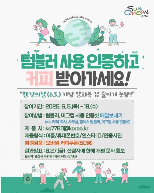 [½Åµ¿¾Æ¹æ¼Û ¼øÃµ=±è³²±â ±âÀÚ] ¼øÃµ½Ã(½ÃÀå ³ë°ü±Ô)´Â Á¦53ȸ ȯ°æÀÇ ³¯(6. 5.)À» ¸Â¾Æ ±âÈĺ¯È­ ´ëÀÀ°ú ź¼ÒÁ߸³ ½Çõ¹®È­ È®»êÀ» À§ÇØ ÀÏȸ¿ë ÄÅ ÁÙÀ̱â SNS À̺¥Æ®¸¦ ¿À´Â 18ÀϱîÁö ÁøÇàÇÑ´Ù°í ¹àÇû´Ù. À̹ø À̺¥Æ®´Â Ä«Æä, »ç¹«½Ç, °¡Á¤ µî¿¡¼­ ÅÒºí·¯ ¶Ç´Â ¸Ó¡¦