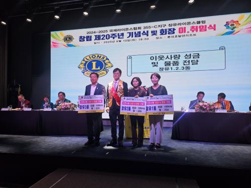 [½Åµ¿¾Æ¹æ¼Û °æ³²±èÇØ=³²±Ã¿µ±â±âÀÚ] ÀåÀ¯¶óÀ̿½ºÅ¬·´Àº Áö³­ 10ÀÏ Ã¢¸³ 20ÁÖ³âÀ» ¸Â¾Æ ±â³ä½ÄÀ» °³ÃÖÇϰí À̸¦ ±â³äÇÏ¿© Áö¿ª »çȸ¸¦ À§ÇÑ ³ª´® ½ÇõÀ¸·Î ÀÌ¿ô»ç¶û ºÀ»ç±Ý 300¸¸¿ø°ú ¹é¹Ì 10kg 99Æ÷¸¦ ±âŹÇÏ¿© ÀåÀ¯1µ¿, 2µ¿, 3µ¿¿¡ °¢°¢ 100¸¸¿ø°ú ¹é¹Ì 10kg 33Æ÷¸¦¡¦
