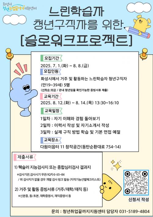 [½Åµ¿¾Æ¹æ¼Û=È­¼ºÆ¯·Ê½Ã(½ÃÀå Á¤¸í±Ù)°¡ ´ÙÀ½ ´Þ 8ÀϱîÁö ´À¸°ÇнÀÀÚ Ã»³â ±¸Á÷ÀÚ¸¦ À§ÇÑ ¡®½½·Î¿öÅ©ÇÁ·ÎÁ§Æ®¡¯¿¡ Âü¿©ÇÒ ±³À°»ýÀ» ¸ðÁýÇÑ´Ù. ¡®½½·Î¿öÅ©ÇÁ·ÎÁ§Æ®¡¯´Â û³â Ã롤â¾÷ Áö¿ø±â°üÀÎ È­¼º½Ã û³âÃë¾÷³¡±îÁö Áö¿ø¼¾ÅͰ¡ Ãë¾÷½ÃÀå¿¡¼­ »ó´ëÀûÀ¸·Î ¼Ò¿ÜµÈ ´À¡¦