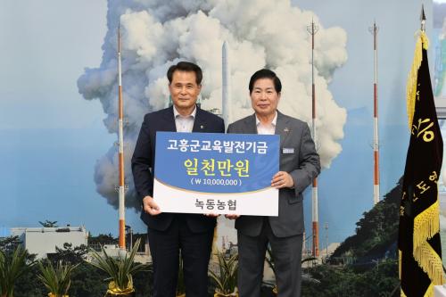 [½Åµ¿¾Æ¹æ¼Û Àü³²°íÈï=¹Ú±¤¿Á±âÀÚ] (»ç)°íÈﱺ±³À°¹ßÀüÀ§¿øÈ¸(ÀÌ»çÀå °ø¿µ¹Î)´Â Áö³­ 14ÀÏ ³ìµ¿³óÇù(Á¶ÇÕÀå ¹Ú±âŹ)À¸·ÎºÎÅÍ ±³À°¹ßÀü±â±Ý 1õ¸¸¿øÀ» ±âŹ¹Þ¾Ò´Ù°í ¹àÇû´Ù. ³ìµ¿³óÇùÀº Áö³­ÇØ¿¡ ÀÌ¾î ¿ÃÇØµµ 1õ¸¸¿øÀ» ±âŹÇßÀ¸¸ç, Áö¿ª ³ó¾÷ ¹ßÀüÀ» ³Ñ¾î û¼Ò³â ±³¡¦