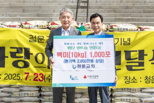 [½Åµ¿¾Æ¹æ¼Û ÀÎõ= À±¹Î½Ä ±âÀÚ]ÀÎõ±¤¿ª½Ã °è¾ç±¸(±¸Ã»Àå À±È¯)´Â 7¿ù 23ÀÏ, °è»êµ¿¿¡ À§Ä¡ÇÑ Ã»¿î±³È¸(´ãÀÓ¸ñ»ç °­´ë¼®)·ÎºÎÅÍ Ãë¾à°èÃþ Áö¿øÀ» À§ÇÑ ¹é¹Ì(10kg) 1,000Æ÷(ȯ°¡¾× 2õ850¸¸ ¿ø »ó´ç)¸¦ Àü´Þ¹Þ¾Ò´Ù°í ¹àÇû´Ù. û¿î±³È¸´Â ¸Å³â Áö¿ª»çȸ ³ª´® Ȱµ¿¿¡ ¡¦