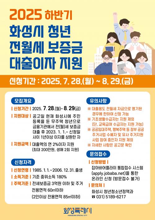 [½Åµ¿¾Æ¹æ¼Û=ÀÌÀçö±âÀÚ] È­¼ºÆ¯·Ê½Ã(½ÃÀå Á¤¸í±Ù)°¡ 28ÀϺÎÅÍ Ã»³âµéÀÇ Áְźñ ºÎ´ã °æ°¨ ¹× Á¤ÁÖ ¿©°Ç Çâ»óÀ» À§ÇØ ¡®Ã»³â Àü¡¤¿ù¼¼ º¸Áõ±Ý ´ëÃâÀÌÀÚ Áö¿ø »ç¾÷¡¯ ÇϹݱ⠴ë»óÀÚ¸¦ ¸ðÁýÇÑ´Ù. Áö¿ø ÀÚ°ÝÀº ¡ãÈ­¼º½Ã Áֹεî·Ï °ÅÁÖ ¡ã±âÁØÁßÀ§¼Òµæ 180% ÀÌÇÏ ¡ãÀü¡¤¿ù¡¦