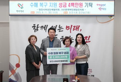 [½Åµ¿¾Æ¹æ¼Û=ÀÌÀçö±âÀÚ] ´çÁø½Ã¿©¼º´ÜüÇùÀÇȸ(ȸÀå ±èÁ¾¼±)¿Í (»ç)Çѱ¹ºÎÀÎȸ´çÁøÁöȸ(ȸÀå ±èÁ¾¼±)´Â 11ÀÏ ´çÁø½Ãû 7Ãþ Á¢°ß½Ç¿¡¼­ ¼öÇØ º¹±¸ Áö¿øÀ» À§ÇØ ÃÑ 400¸¸ ¿øÀÇ ¼º±ÝÀ» ±âŹÇß´Ù. À̹ø ¼º±ÝÀº ÁýÁßÈ£¿ì·Î ÇÇÇØ¸¦ º» ÀÌ¿ôµéÀÇ Á¶¼ÓÇÑ »ýȰ ¾ÈÁ¤°ú ÇÇÇØ º¹±¸¡¦