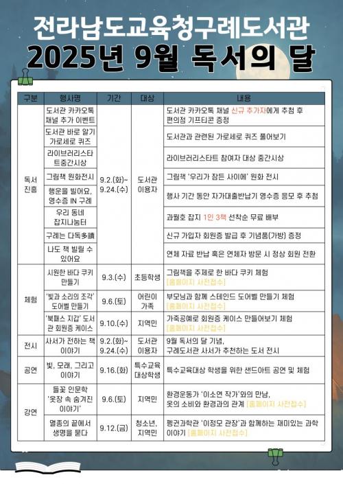 [½Åµ¿¾Æ¹æ¼Û Àü³²±¸·Ê=À̽ŵ¿±âÀÚ] Àü¶ó³²µµ±³À°Ã»±¸·Êµµ¼­°üÀº 9¿ù ¡®µ¶¼­ÀÇ ´Þ¡¯À» ¸Â¾Æ, Ã¥ÀÌ ÁÖ´Â ±â»ÝÀ» Áö¿ª¹Î°ú ³ª´©±â À§ÇØ ´Ùä·Î¿î µ¶¼­¹®È­Çà»ç¸¦ ¸¶·ÃÇß´Ù. À̹ø Çà»ç´Â ´Ü¼øÇÑ µ¶¼­ Ȱµ¿À» ³Ñ¾î, Áö½Ä°ú °¨¼ºÀ» ÇÔ²² ä¿ì´Â ½Ã°£À» ¼±»çÇϸç, µµ¼­°üÀÌ ¹®È­¡¦