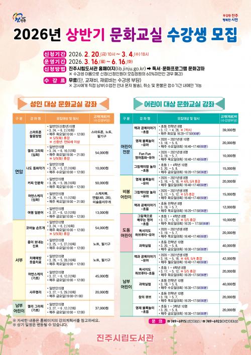 [½Åµ¿¾Æ¹æ¼Û °æ³²ÁøÁÖ=³²±Ã¿µ±â±âÀÚ] ÁøÁֽø³µµ¼­°üÀº ¿À´Â 20ÀϺÎÅÍ ¾î¸°ÀÌ¿Í ¼ºÀÎÀ» ´ë»óÀ¸·Î ¡®2026³â »ó¹Ý±â ¹®È­±³½Ç¡¯ ¼ö°­»ýÀ» ¸ðÁýÇÑ´Ù. ¡®¾î¸°ÀÌ ¹®È­±³½Ç¡¯Àº 3¿ù 16ÀϺÎÅÍ 5¿ù 18ÀϱîÁö ¾î¸°ÀÌÀü¹®¡¤µµµ¿¾î¸°ÀÌ¡¤ºñºÀ¾î¸°ÀÌ¡¤³²ºÎ¾î¸°À̵µ¼­°ü¿¡¼­ °úÇнǡ¦