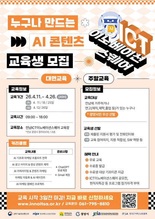[½Åµ¿¾Æ¹æ¼Û Àü³²±¤¾ç=¹Ú±¤¿Á±âÀÚ] ±¤¾ç½Ã´Â 3¿ù 16ÀϺÎÅÍ 4¿ù 8ÀϱîÁö ¡®´©±¸³ª ¸¸µå´Â AI ÄÜÅÙÃ÷¡¯ ±³À°»ýÀ» ¸ðÁýÇÑ´Ù°í ¹àÇû´Ù. À̹ø ±³À°Àº »ý¼ºÇü ÀΰøÁö´É(AI)À» Ȱ¿ëÇÑ ÄÜÅÙÃ÷ Á¦ÀÛ ¿ª·®À» ³ôÀ̱â À§ÇØ ¸¶·ÃµÆÀ¸¸ç, 4¿ù 11ÀϺÎÅÍ 4¿ù 26ÀϱîÁö ÁÖ¸» 5Àϰ£ ÃÑ ¡¦
