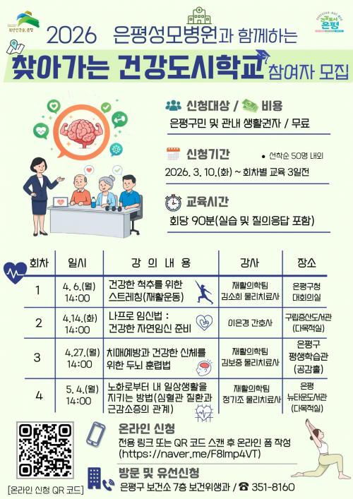 [½Åµ¿¾Æ¹æ¼Û ÀºÆò±¸=À̽ŵ¿±âÀÚ] ¼­¿ï ÀºÆò±¸´Â ±¸¹ÎµéÀÇ °Ç°­ÇÑ »ýȰÀ» Áö¿øÇϱâ À§ÇØ ¡®Ã£¾Æ°¡´Â °Ç°­µµ½ÃÇб³¡¯ Âü¿©ÀÚ¸¦ ¸ðÁýÇÑ´Ù°í ¹àÇû´Ù. ¡®Ã£¾Æ°¡´Â °Ç°­µµ½ÃÇб³¡¯´Â ÁֹΠ»ýȰ±ÇÀ¸·Î Á÷Á¢ ã¾Æ°¡´Â °Ç°­±³À° ÇÁ·Î±×·¥À¸·Î, ±¸¹ÎµéÀÌ Àϻ󿡼­ ½ÇõÇÒ ¼ö ÀÖ¡¦