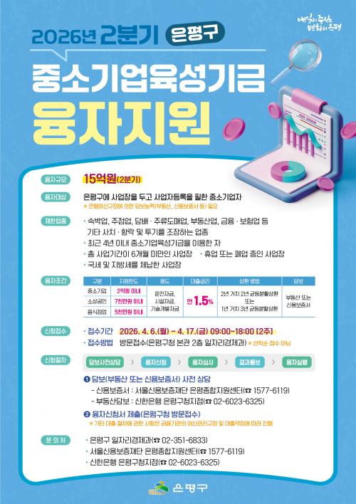 [½Åµ¿¾Æ¹æ¼Û ÀºÆò±¸=À̽ŵ¿±âÀÚ] ¼­¿ï ÀºÆò±¸´Â °ü³» Áß¼Ò±â¾÷°ú ¼Ò»ó°øÀÎÀÇ °æ¿µ ¾ÈÁ¤À» À§ÇØ 15¾ï ¿ø ±Ô¸ðÀÇ 2026³â 2ºÐ±â Áß¼Ò±â¾÷À°¼º±â±Ý À¶ÀÚ¸¦ ½ÃÇàÇÑ´Ù°í ¹àÇû´Ù. Áö¿ø ´ë»óÀº ÀºÆò±¸¿¡ »ç¾÷ÀåÀ» µÎ°í »ç¾÷ÀÚµî·ÏÀ» ¿Ï·áÇÑ Áß¼Ò±â¾÷°ú ¼Ò»ó°øÀÎÀ¸·Î, »ç¾÷Àڵ