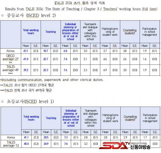 ¡à TALIS 2024¿¡ µû¸£¸é, ¿ì¸®³ª¶ó ÀüÀÓ Áߵ»çÀÇ ÁÖ(ñÎ)´ç ÃÑ ±Ù¹«½Ã°£Àº 43.1½Ã°£À¸·Î OECD Æò±Õ(41.0½Ã°£)º¸´Ù 2.1½Ã°£, Àüü Á¶»ç±¹ Æò±Õ(39.2½Ã°£)º¸´Ù 4.1½Ã°£ ´õ ¸¹¾Ò´Ù.
