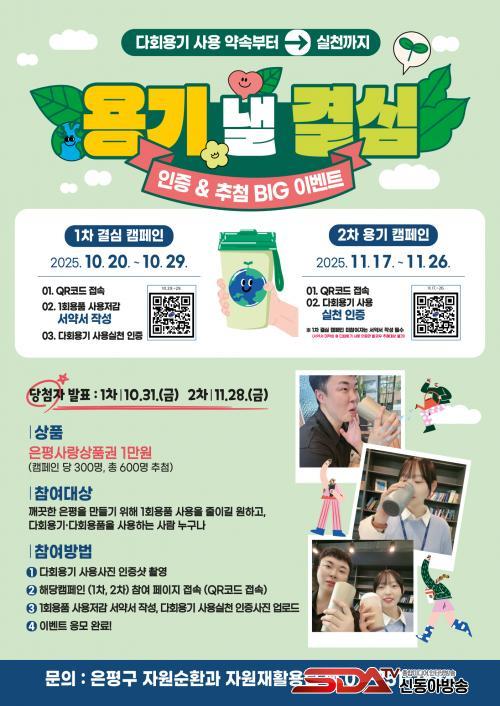 1Â÷ ¡®°á½É Ä·ÆäÀΡ¯Àº 1ȸ¿ëǰ »ç¿ëÀ» ÁÙÀ̰ڴٴ ¼¾à¼¸¦ ÀÛ¼ºÇϰí, ´Ùȸ¿ë±â »ç¿ë ÀÎÁõ»çÁøÀ» ¿Ã¸®¸é µÈ´Ù. 2Â÷ ¡®¿ë±â Ä·ÆäÀΡ¯¿¡¼´Â ½ÇÁ¦ ´Ùȸ¿ë±â »ç¿ë »çÁøÀ» ÀÎÁõÇÏ´Â ¹æ½ÄÀ¸·Î Âü¿©ÇÒ ¼ö ÀÖ´Ù. Âü¿©ÀÚ Áß È¸Â÷´ç 300¸íÀ» ÃßÃ·ÇØ ÃÑ 600¸í¿¡°Ô 1¸¸ ¿ø »ó´çÀÇ ÀºÆò»ç¶û»óǰ±ÇÀ» Áö±ÞÇÑ´Ù. 1Â÷¿Í 2Â÷ÀÇ Áߺ¹ Âü¿©°¡ °¡´ÉÇÏ´Ù.