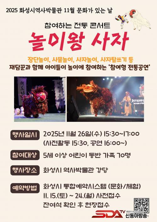 À̳¯ 15½Ã 30ºÐºÎÅÍ´Â »çÀü ÇÁ·Î±×·¥À¸·Î Àü½Ã½Ç ¼Ó ÀüÅë ³îÀ̸¦ ¾Ë¾Æº¸´Â ¡®È°µ¿Áö Ç®ÀÌ Ã¼Ç衯ÀÌ ÁøÇàµÇ¸ç, 16½ÃºÎÅÍ´Â º» °ø¿¬À¸·Î »ç¹°³îÀÌ¡¤»çÀÚÅ»³îÀÌ µî ¾î¸°À̰¡ Á÷Á¢ Âü¿©ÇÏ´Â ÀüÅë³îÀÌ ÄܼƮ ¡®³îÀÌ¿Õ »çÀÚ¡¯°¡ ¿î¿µµÈ´Ù.