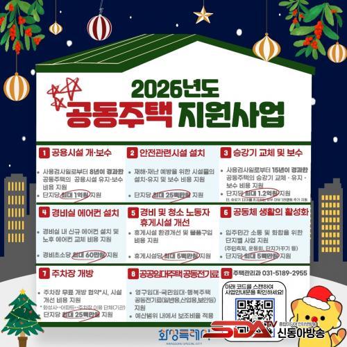 2026³â °øµ¿ÁÖÅà Áö¿ø»ç¾÷À¸·Î´Â À̹ø¿¡ ¸ðÁýÇÏ´Â ½Â°­±â ±³Ã¼ ¹× º¸¼ö Áö¿ø»ç¾÷ ¿Ü¿¡ °ø¿ë½Ã¼³ °³º¸¼ö Áö¿ø, °øµ¿ÁÖÅà ±Ù·ÎÀÚ È¯°æ°³¼± Áö¿ø µîÀÌ ÃßÁøµÇ¸ç, 2026³â 1¿ù Áß ºÐ¾ßº° ¼¼ºÎ Áö¿ø ¿ä°Ç°ú ½Åû ÀýÂ÷°¡ ¸ðÁý ½Ã±âº°·Î º°µµ °ø°íµÉ ¿¹Á¤ÀÌ´Ù.