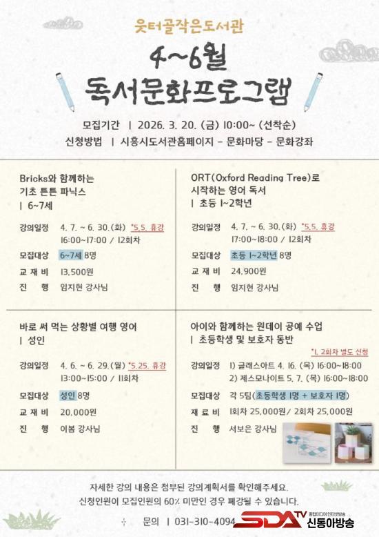 ¿µ¾î Æ¯È ÇÁ·Î±×·¥Àº ¡ãÀ¯¾Æ ´ë»ó ±âÃÊ ÆÄ´Ð½º °úÁ¤ ¡®ºê¸¯½º(Bricks)¿Í ÇÔ²²ÇÏ´Â ±âÃÊ Æ°Æ° ÆÄ´Ð½º¡¯ ¡ãÃʵî 1~2Çг⠴ë»ó ¿µ¾î ¿ø¼ µ¶¼ ÇÁ·Î±×·¥ÀÎ ¡®¿À¾ËƼ(ORT, Oxford Reading Tree)·Î ½ÃÀÛÇÏ´Â ¿µ¾î µ¶¼¡¯ ¡ã¼ºÀÎ ´ë»ó ¿µ¾î È¸È °úÁ¤ ¡®¹Ù·Î ½á¸Ô´Â »óȲº° ¿©Çà ¿µ¾î¡¯·Î ¿¬·Éº° ¸ÂÃãÇü °Á·Π±¸¼ºµÆ´Ù. °Áº° ¸ðÁý ÀοøÀº ¼Ò±Ô¸ð(8¸í)·Î ±¸¼ºÇØ Âü¿©ÀÚ Áß½ÉÀÇ ¼ö¾÷ÀÌ ÁøÇàµÉ ¿¹Á¤ÀÌ´Ù.
