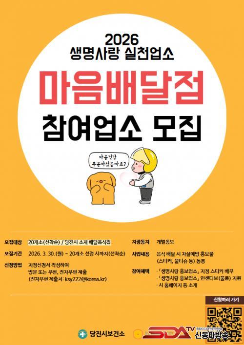 [½Åµ¿¾Æ¹æ¼Û=ÀÌÀçö±âÀÚ] ´çÁø½Ã´Â Áö¿ª»çȸ ³» ÀÚ»ì ¿¹¹æ ¾ÈÀü¸Á ±¸Ãà°ú 1ÀÎ °¡±¸ÀÇ Á¤½Å°Ç°­ À§±â ±Øº¹À» À§ÇØ ¿À´Â 30ÀϺÎÅÍ 2026³â ¡®¸¶À½¹è´ÞÁ¡¡¯ ½Å±Ô Âü¿© ¾÷¼Ò¸¦ ¸ðÁýÇÑ´Ù°í 27ÀÏ ¹àÇû´Ù.