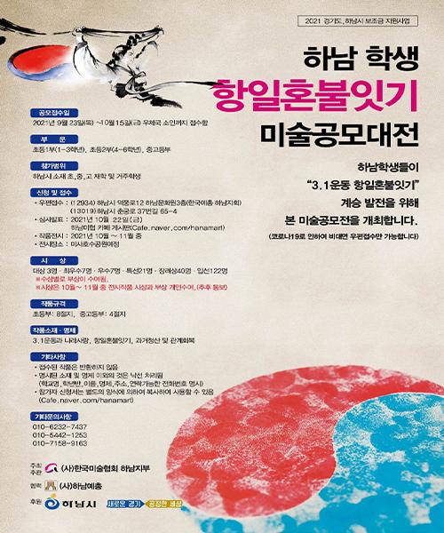 »ç´Ü¹ýÀÎ Çѱ¹¹Ì¼úÇùȸ Çϳ²ÁöºÎ°¡ ÁÖ°üÇϰí Çϳ²½Ã, °æ±âµµÈÄ¿øÇÏ´Â À̹ø ¹Ì¼ú °ø¸ðÀüÀº ÀÏÁ¦ÀÇ ½Ä¹Î ÅëÄ¡¿¡ Ç×°ÅÇÏ¿© µ¶¸³¸¸¼¼ÀÇ ÇÔ¼º ¼Ò¸®°¡ ÈûÂ÷°Ô ¿ï·Á ÆÛÁ³´ø ´ç½Ã¸¦ ±â¸®°íÀÚ 3.1¿îµ¿ 100Áֳ⠱â³ä Çϳ²Çлý Ç×ÀÏÈ¥ºÒÀÕ±â¹Ì¼ú ¹Ì¼ú°ø¸ðÀüÀ» °³ÃÖÇÑ´Ù.