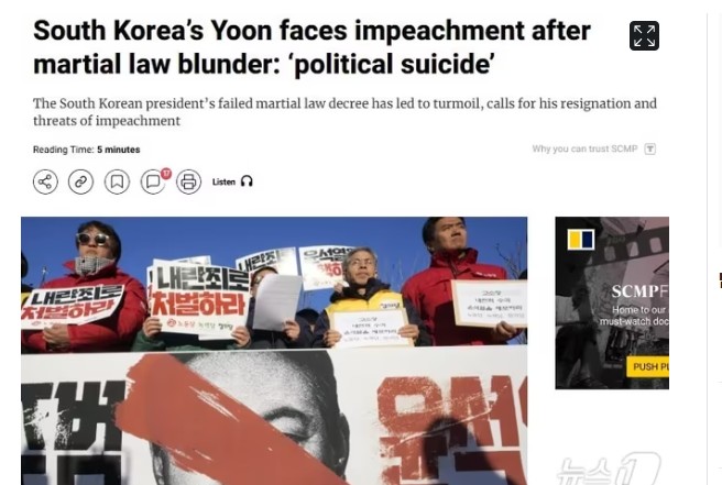È«Äá Àϰ£ »ç¿ì½ºÂ÷À̳ª¸ð´×Æ÷½ºÆ®(SCMP)µµ '°è¾ö·É ½Ç¼ö·Î Çѱ¹ÀÇ ´ëÅë·ÉÀÌ ÅºÇÙ À§±â¿¡ óÇß´Ù. Á¤Ä¡Àû ÀÚ»ì'À̶ó´Â Á¦ÇÏÀÇ ±â»ç¸¦ ÅëÇØ Çѱ¹ÀÇ »óȲ°ú Á¤Ä¡Àû Àü¸ÁÀ» ¼Ò°³Çߴµ¥,(Lin jing zi ƯÆÄ¿ø)
