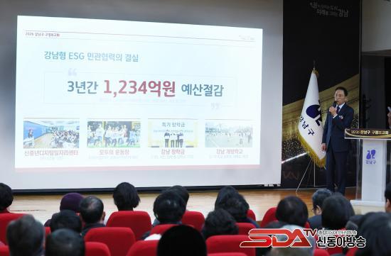 Á¶¼º¸í °­³²±¸Ã»ÀåÀº ¡°±¸Á¤º¸°íȸ´Â ÇÑ ÇØ ±¸Á¤ ¿î¿µ ¹æÇâ°ú ÁÖ¿ä »ç¾÷À» ±¸¹Î¿¡°Ô ¼³¸íÇÏ°í °øÀ¯ÇÏ´Â ÀÚ¸®¡±¶ó¸ç ¡°°­³²±¸ ¹Ì·¡ Àü·«ÀÎ ¡®10ºÐ µµ½Ã¡¯´Â ±¸¹ÎÀÇ ÀÏ»ó°ú »ýȰ±ÇÀ» ±âÁØÀ¸·Î ¸¸µé¾î°¡´Â ÇÁ·ÎÁ§Æ®ÀÎ ¸¸Å­, ±¸¹Î°ú Áö¼ÓÀûÀ¸·Î ¼ÒÅëÇÏ¸ç ¹Ì·¡ °­³²À» ÇÔ²² ¸¸µé¾î°¡°Ú´Ù¡±°í ¹àÇû´Ù.