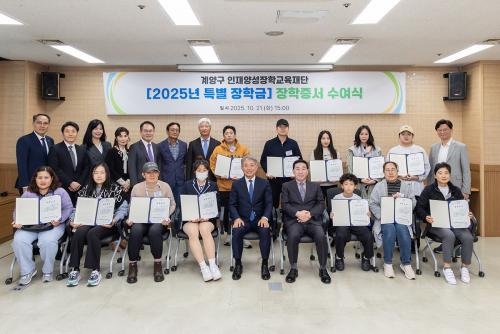 [½Åµ¿¾Æ¹æ¼Û ÀÎõ=À±¹Î½Ä±âÀÚ](Àç)ÀÎõ±¤¿ª½Ã °è¾ç±¸ ÀÎÀç¾ç¼ºÀåÇб³À°Àç´Ü(ÀÌ»çÀå ÀÌ³ë°æ)Àº 10¿ù 21ÀÏ, Ưº° ÀåÇлý 27¸íÀ» ¼±¹ßÇØ ÀåÇÐÁõ¼­¸¦ ¼ö¿©Çß´Ù°í ¹àÇû´Ù. À̹ø¿¡ ¼±¹ßµÈ ÀåÇлýÀº Áö³­ 8¿ù ±â·ÏÀûÀÎ Æø¿ì·Î ÇÇÇØ¸¦ ÀÔÀº Àç³­Áö¿ø±Ý ÀÎÁ¤ ¼¼´ëÀÇ Çлýµé·Î¡¦