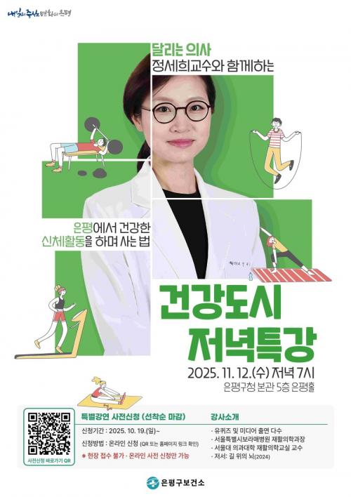 [½Åµ¿¾Æ¹æ¼Û ÀºÆò±¸=À̽ŵ¿±âÀÚ] ¼­¿ï ÀºÆò±¸´Â ³»´Þ 12ÀÏ ¿ÀÈÄ 7½Ã, ÀºÆò±¸Ã» º»°ü 5Ãþ ÀºÆòȦ¿¡¼­ ¡®´Þ¸®´Â ÀÇ»ç Á¤¼¼Èñ ±³¼ö¿Í ÇÔ²²ÇÏ´Â °Ç°­µµ½Ã Ư°­¡¯À» °³ÃÖÇÑ´Ù°í ¹àÇû´Ù. À̹ø Ư°­Àº ¡®°Ç°­µµ½Ã Ȱµ¿Àû »ýȰȯ°æ Á¶¼º»ç¾÷¡¯ÀÇ ÀÏȯÀ¸·Î, ±¸¹ÎµéÀÌ ÀÏ»ó ¼Ó¡¦