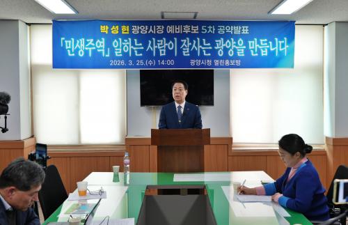 [½Åµ¿¾Æ¹æ¼Û Àü³²±¤¾ç=¹Ú±¤¿Á] ¹Ú¼ºÇö ±¤¾ç½ÃÀå ¿¹ºñÈ帴 25ÀÏ ¹Î»ý Á᫐ Á¤Ã¥ ºñÀüÀ» ¹ßÇ¥ÇÏ°í ¡°¹öƼ´Â °æÁ¦¸¦ ³¡³»°í, ÀÏÇÏ´Â »ç¶÷ÀÌ Àß»ç´Â ±¤¾çÀ¸·Î ÀüȯÇϰڴ١±°í ¹àÇû´Ù. ¹Ú¼ºÇö ¿¹ºñÈ帴 À̳¯ ¡°±¤¾çÀº »ê¾÷°ú °æÁ¦ ±Ô¸ð´Â ¼ºÀåÇßÁö¸¸, ½Ã¹ÎÀÌ Ã¼°¨Çϴ¡¦